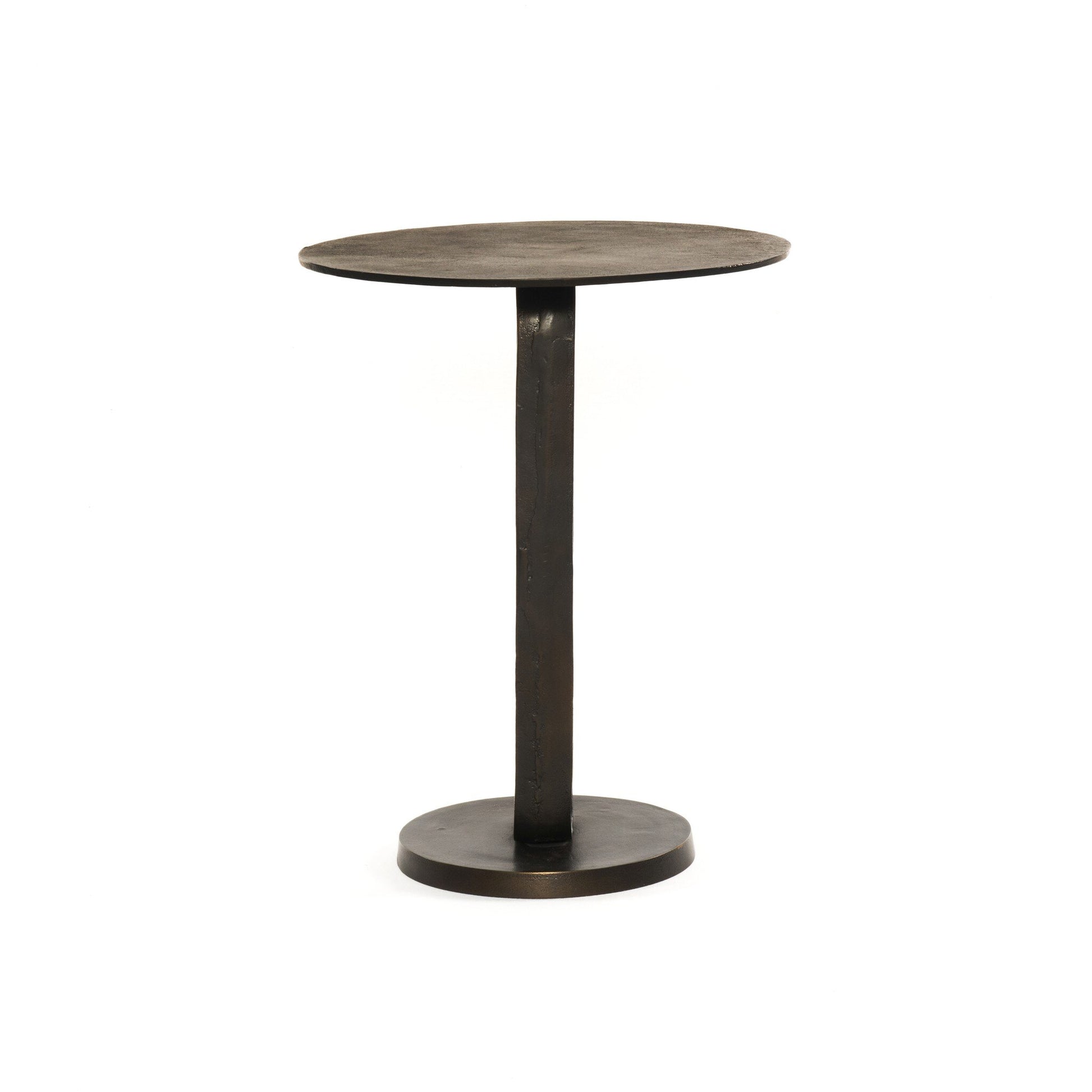 Precise curves with modern presence. Rounded base and tabletop of antique rust-finished aluminum are connected via a shapely ring, for an open look and fun blend of scale and proportion. Safe for outdoor spaces. Cover or store indoors during inclement weather and when not in use.